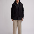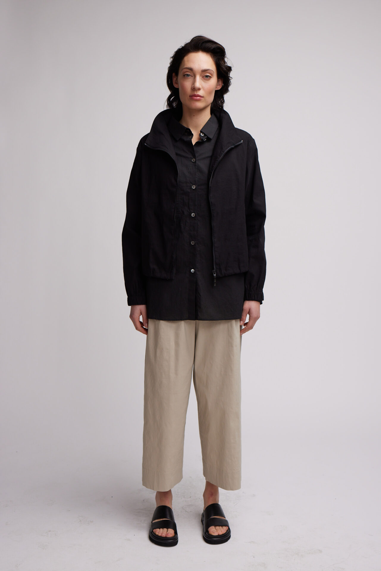 kurze jacke aus ihochwertigem talienischem leinenstretch. stehkragen mit vorderem reißverschluß. ärmelbündchen mit gummi und saum mit tunnelzug. seitliche eingriffstaschen