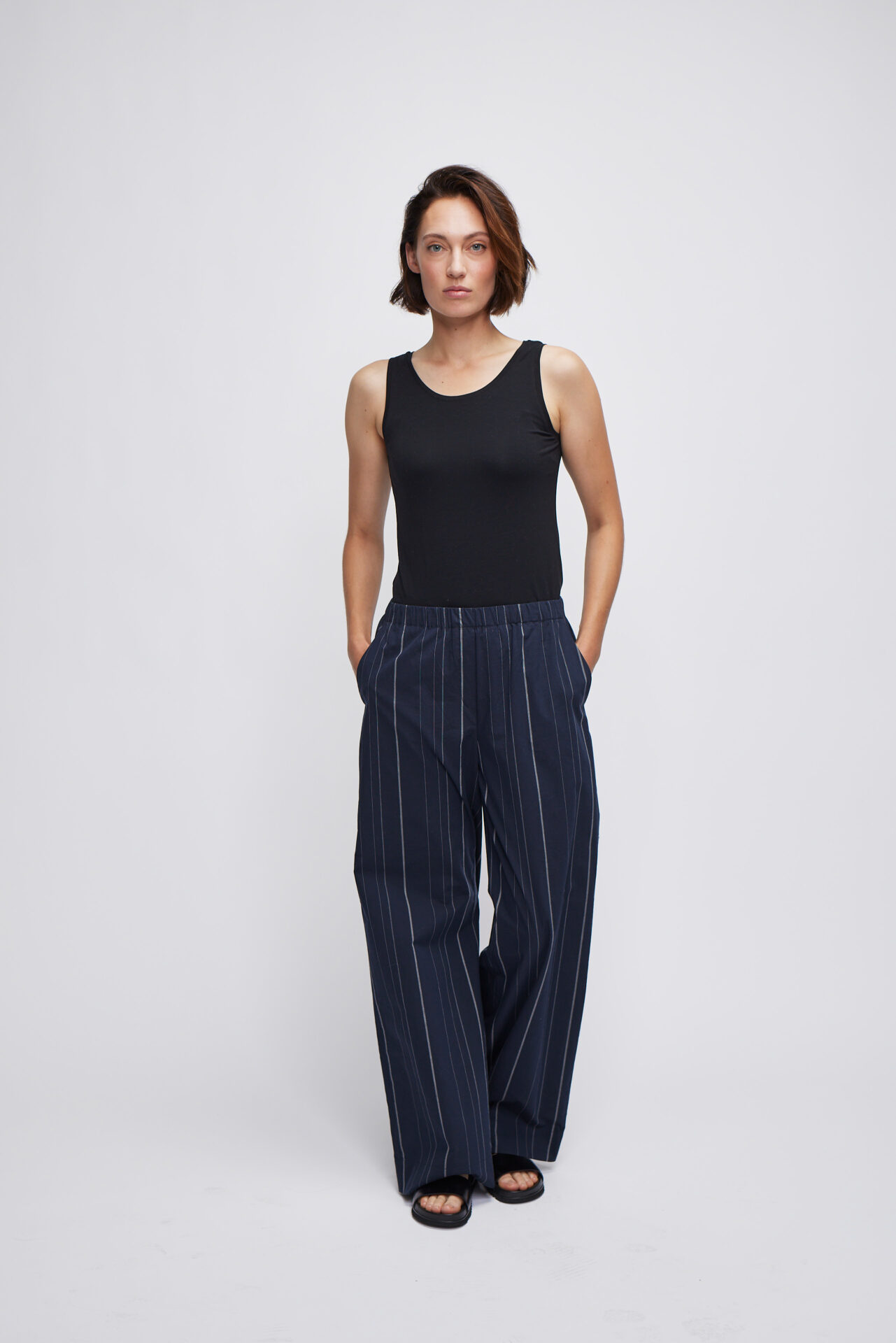 weit geschnittene hose mit elastischem bund aus hochwertiger italienischer baumwolle.mit feinem unregelmäßigem streifen. seitliche eingriffstaschen, fließende silhouette